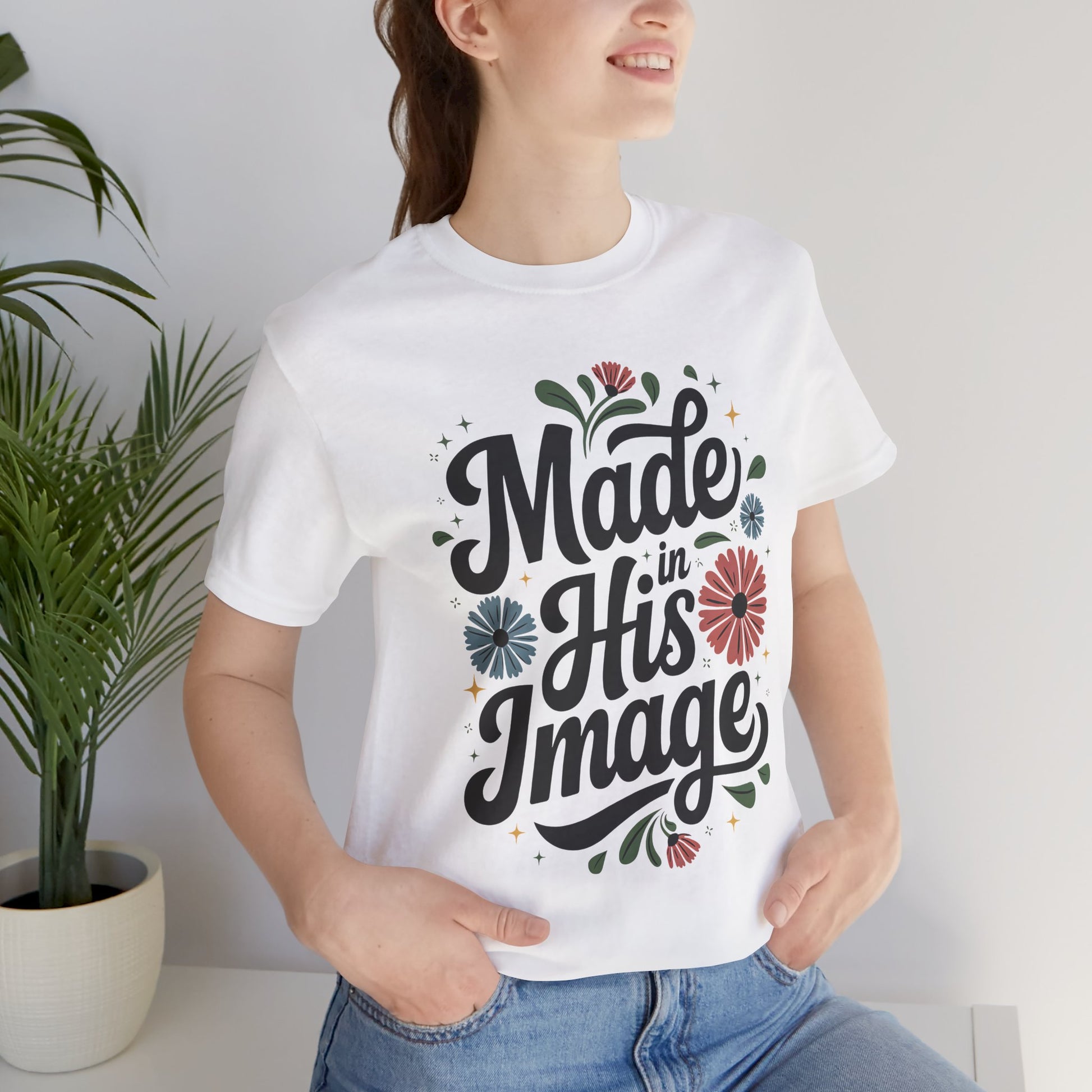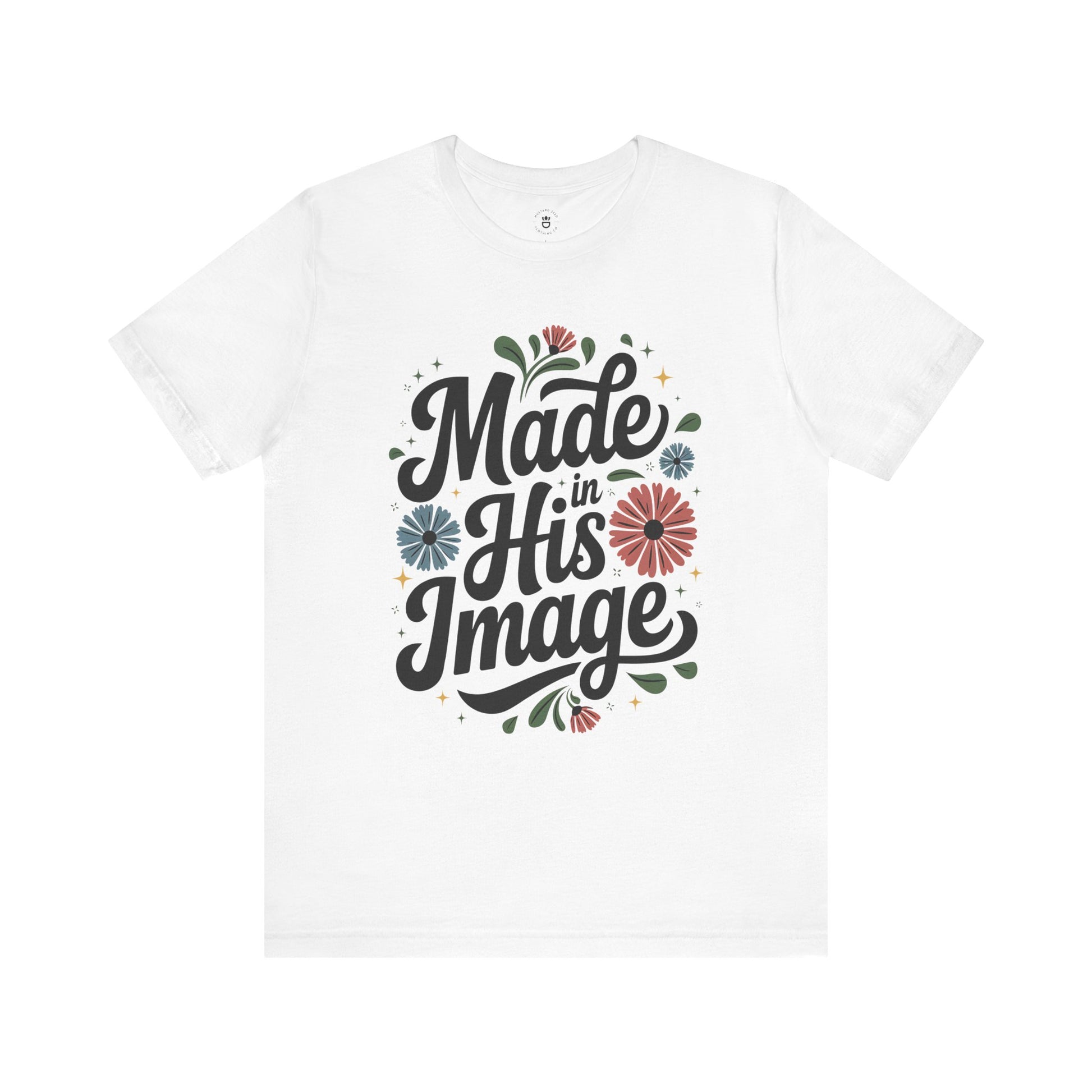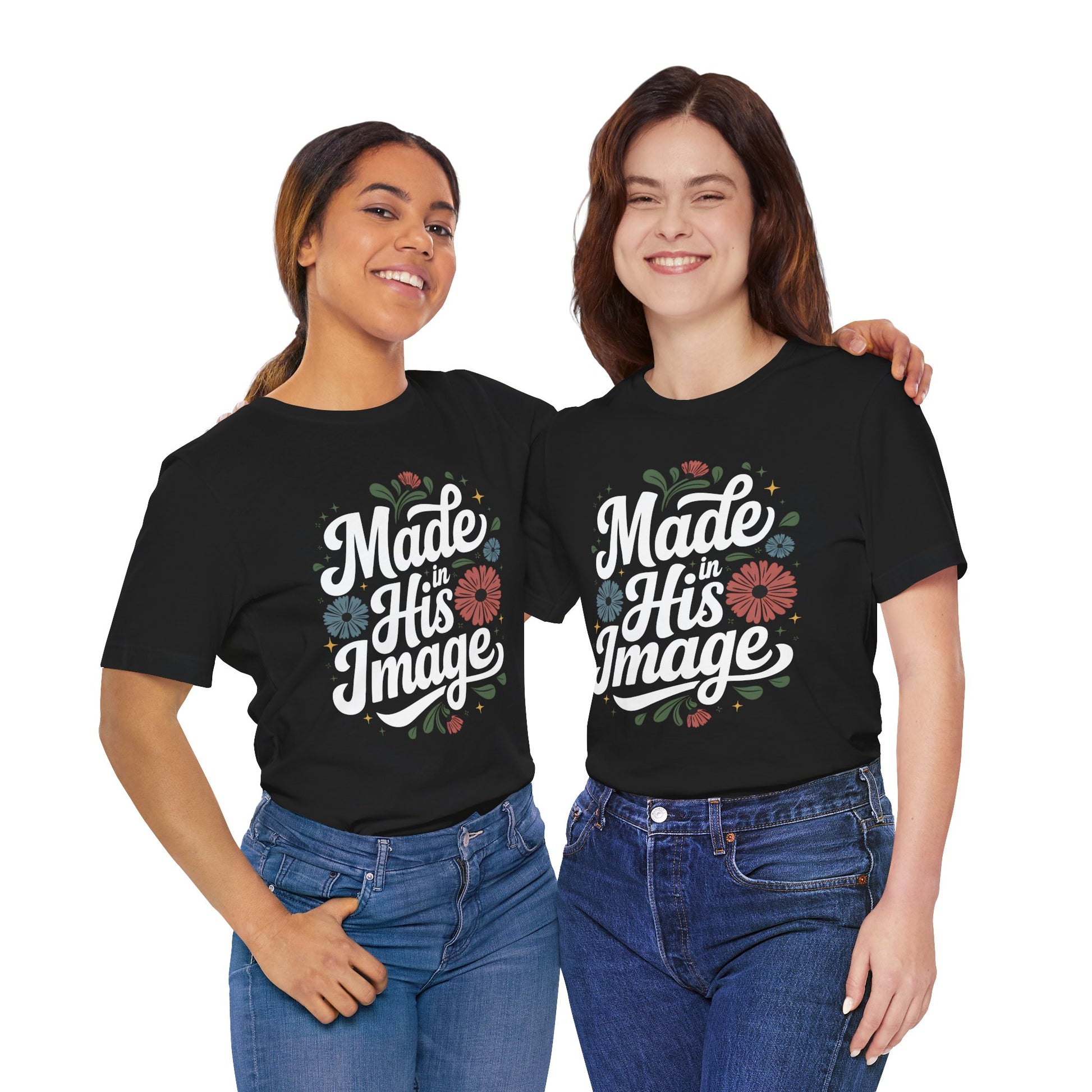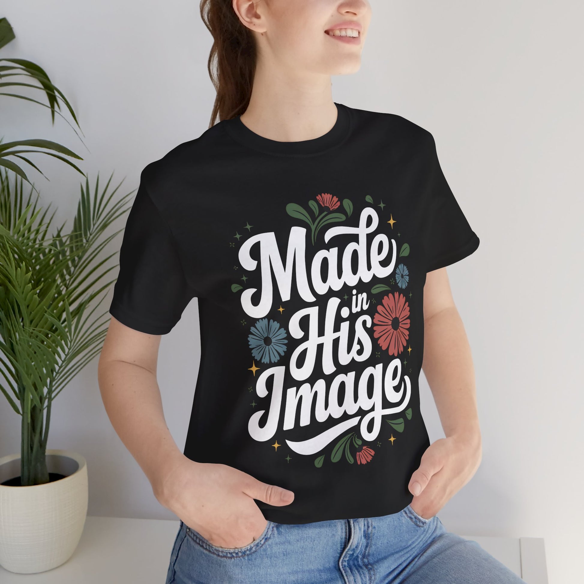 Embrace your faith and style with our "In His Image" women's t-shirt. Featuring bold script typography and delicate floral design elements, this tee beautifully blends spirituality with fashion. Perfect for everyday wear or church gatherings, it's a heartfelt reminder of your identity in Christ.