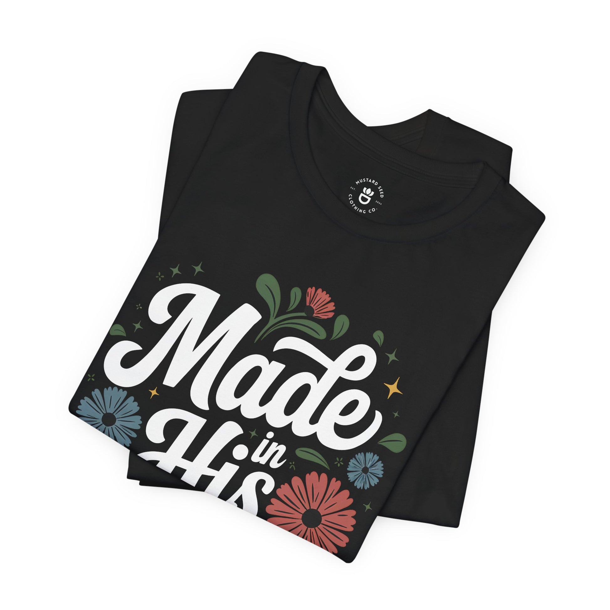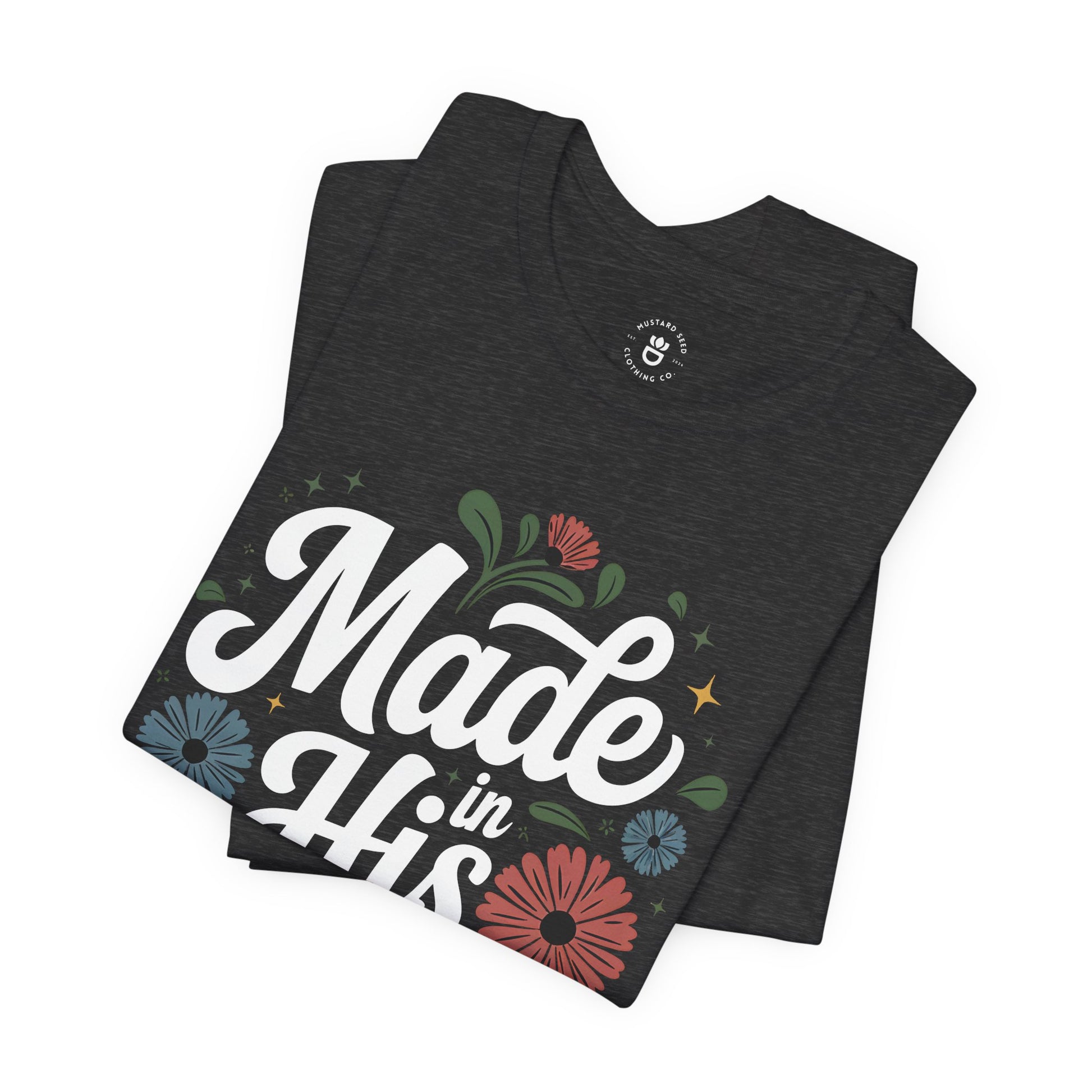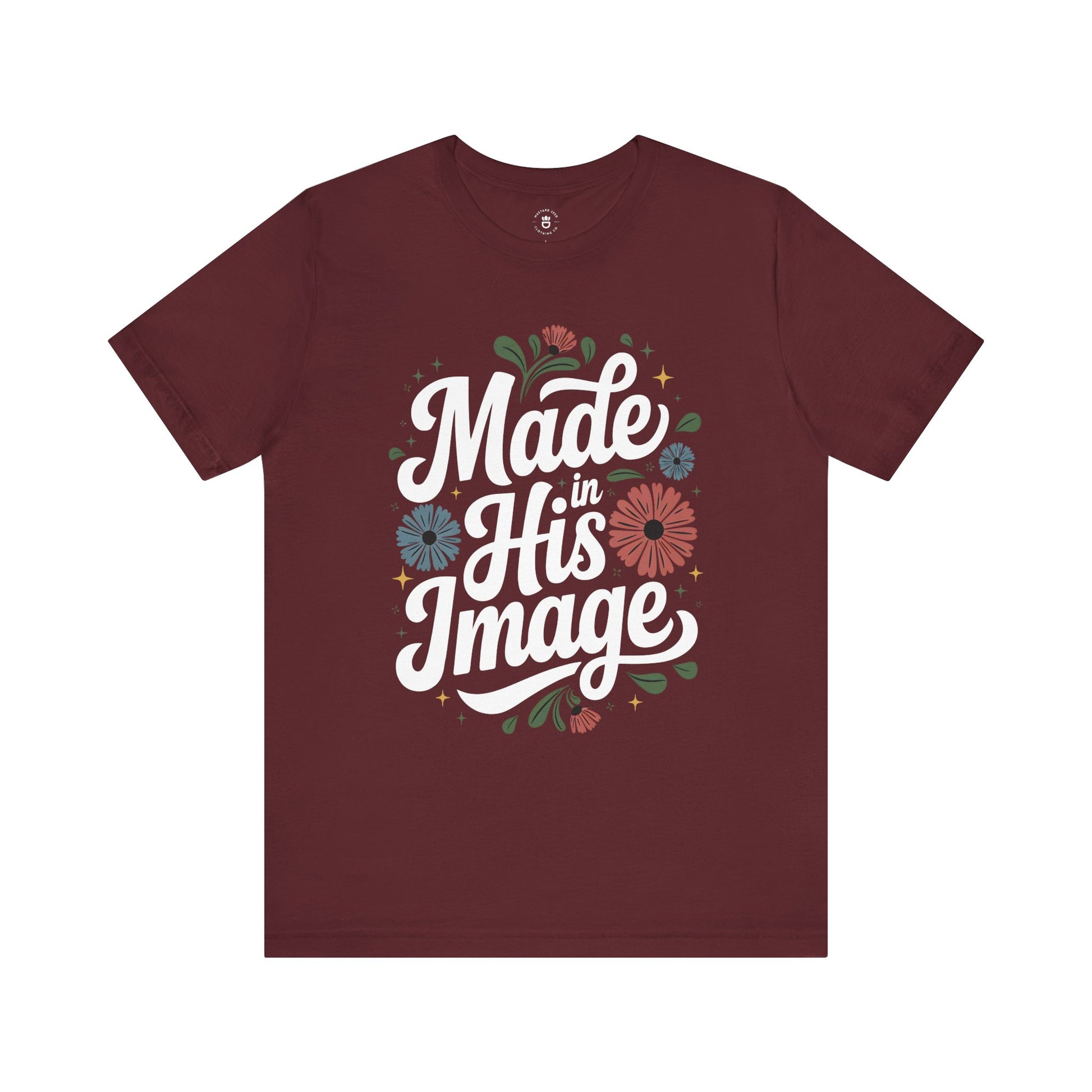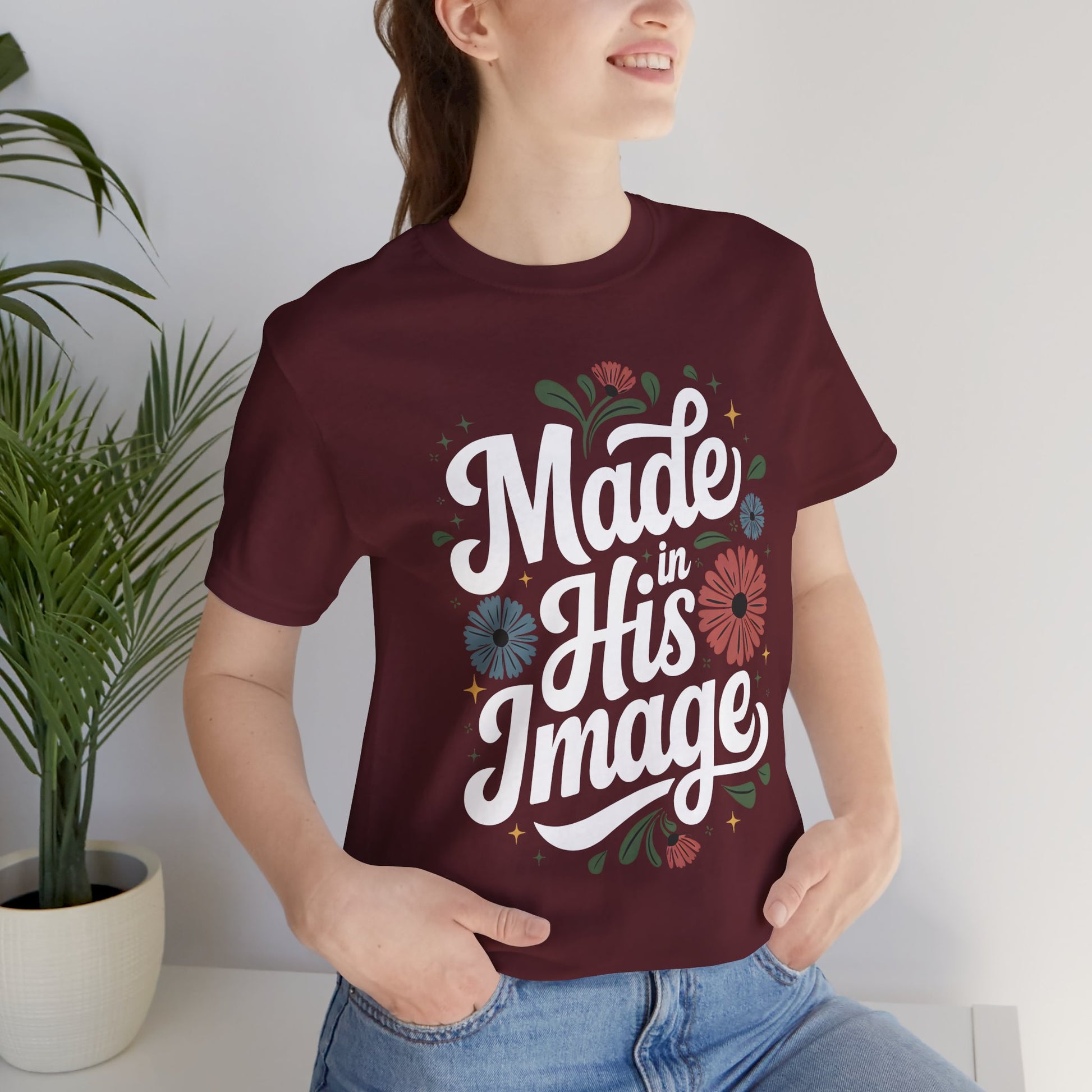 Embrace your faith and style with our "In His Image" women's t-shirt. Featuring bold script typography and delicate floral design elements, this tee beautifully blends spirituality with fashion. Perfect for everyday wear or church gatherings, it's a heartfelt reminder of your identity in Christ.