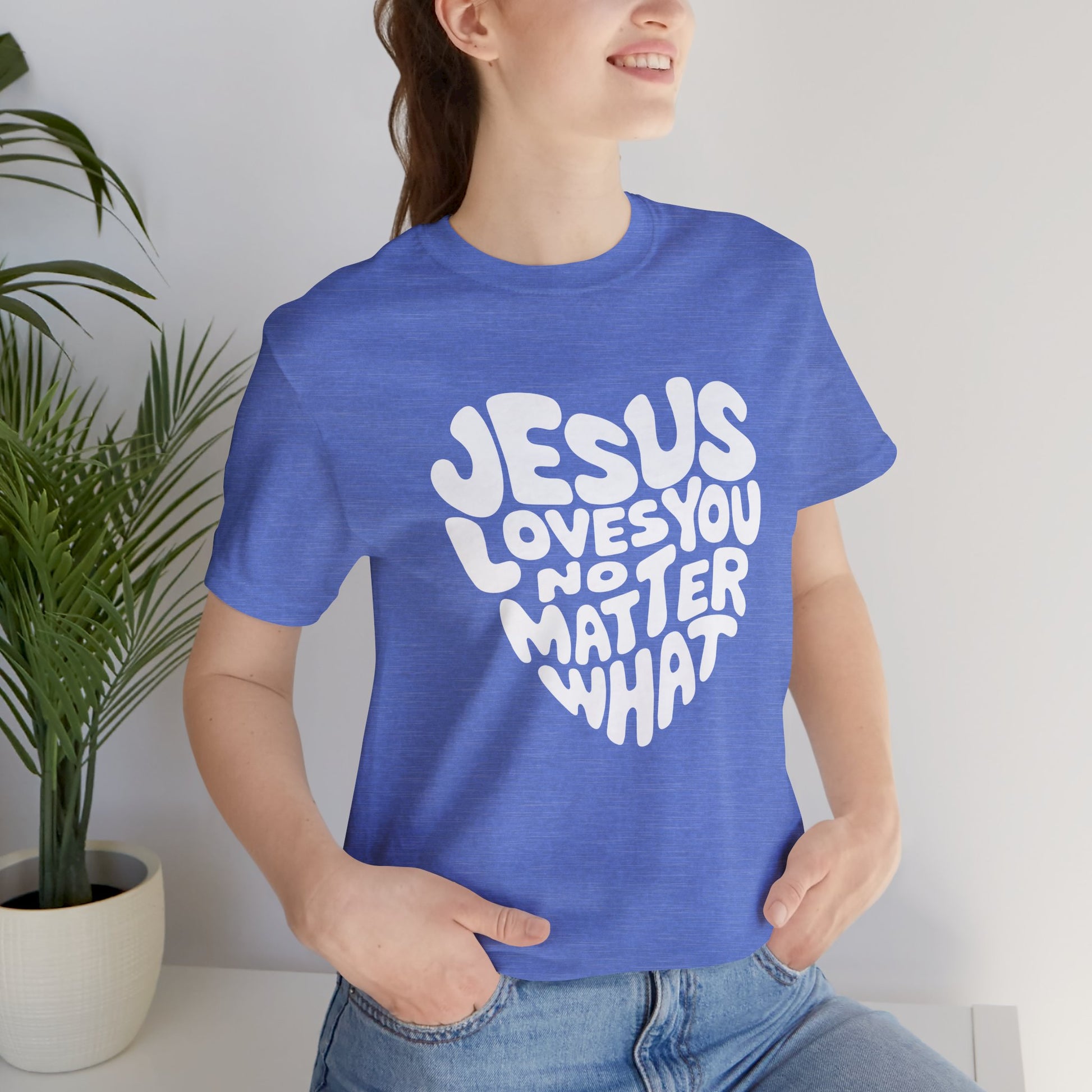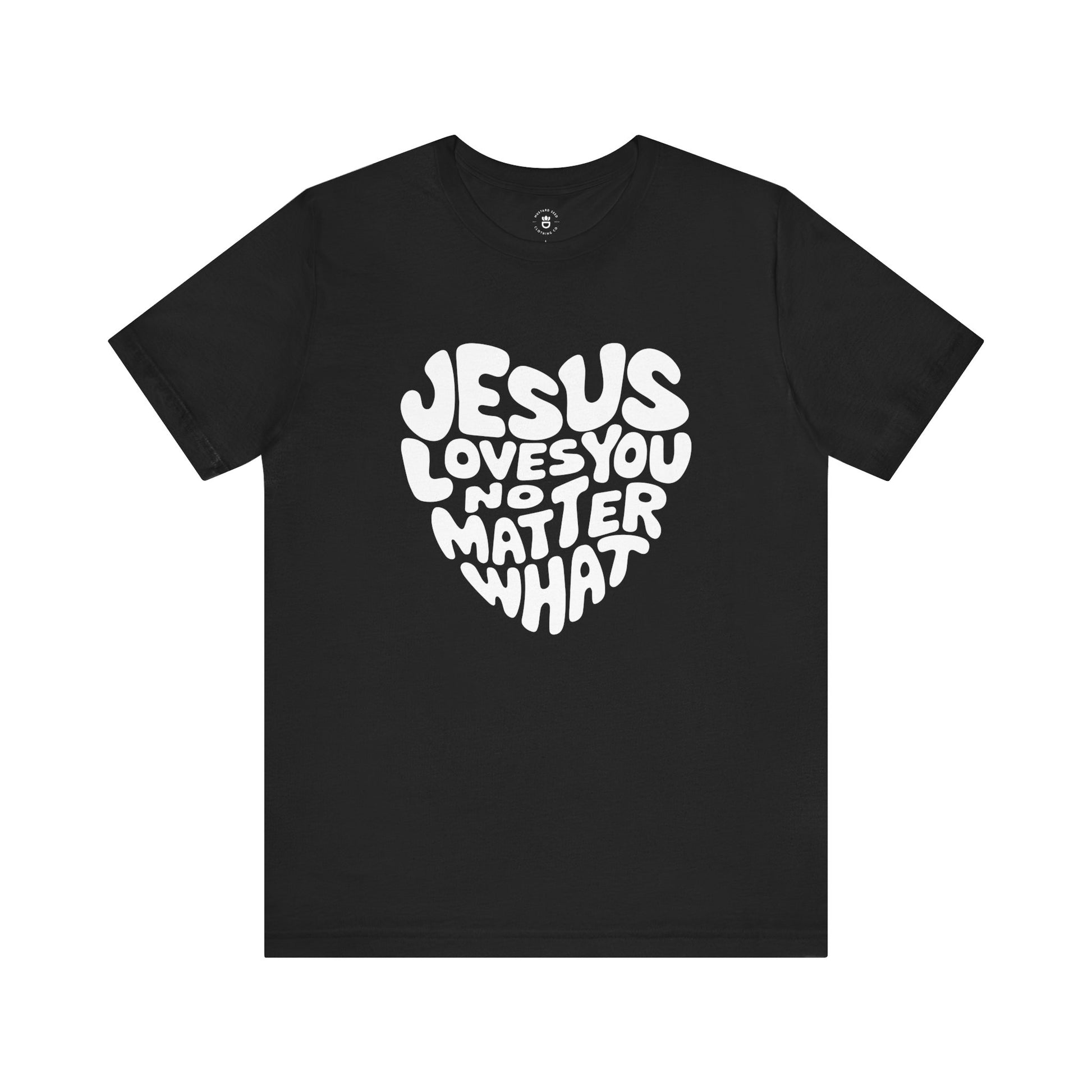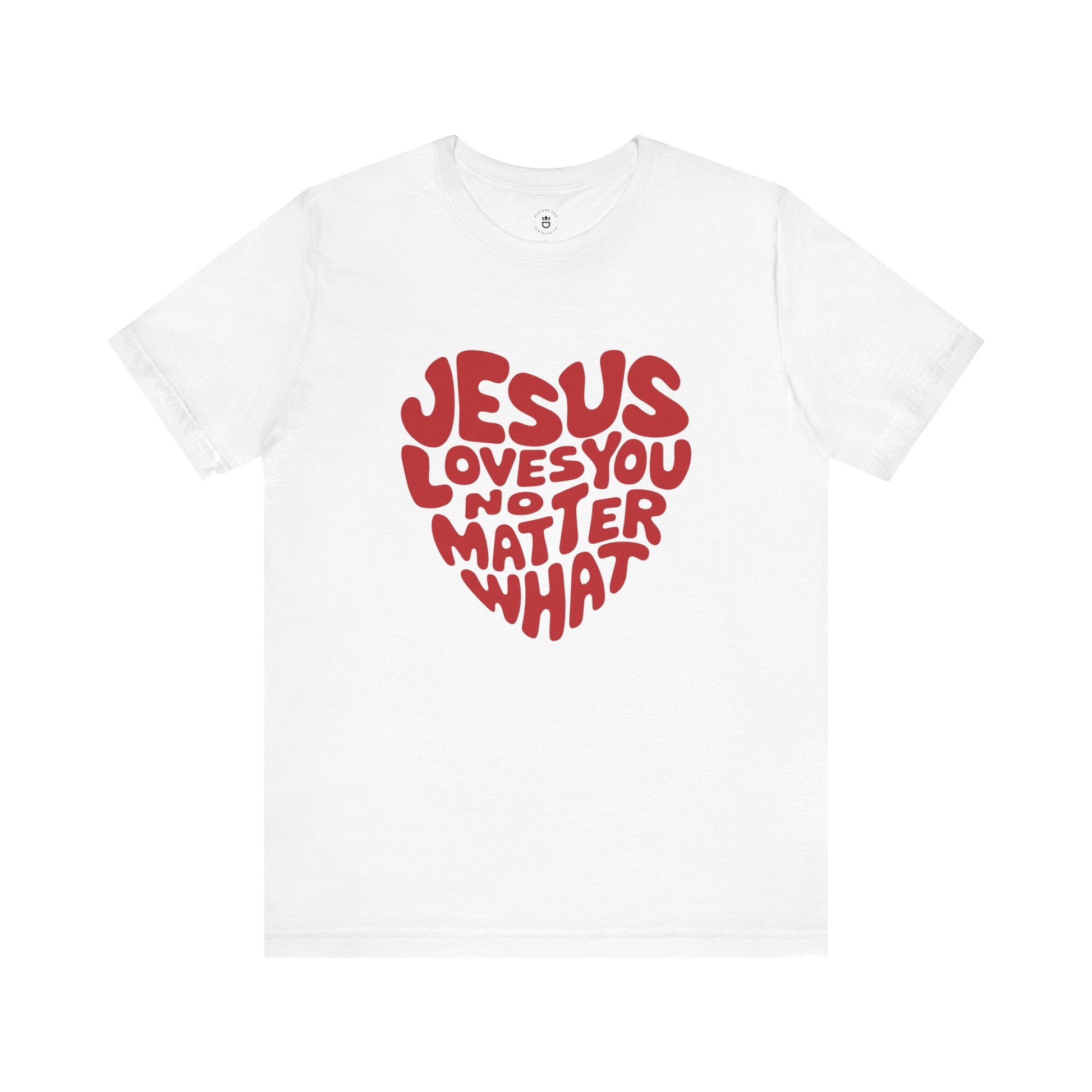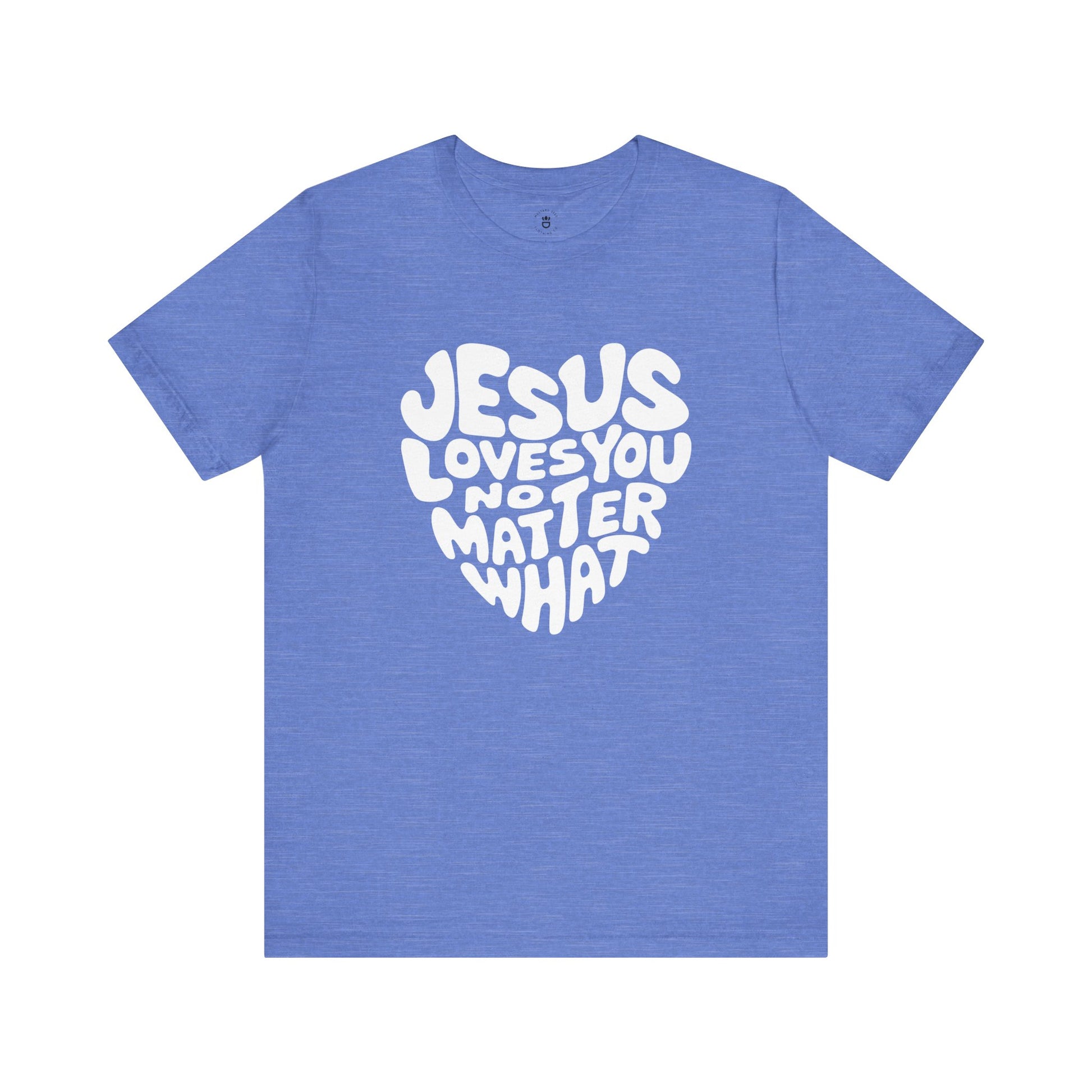Spread love and positivity with this tee featuring the heartfelt message "Jesus Loves You No Matter What" beautifully crafted in the shape of a heart. Wear it proudly and remind others of the unconditional love of Jesus!