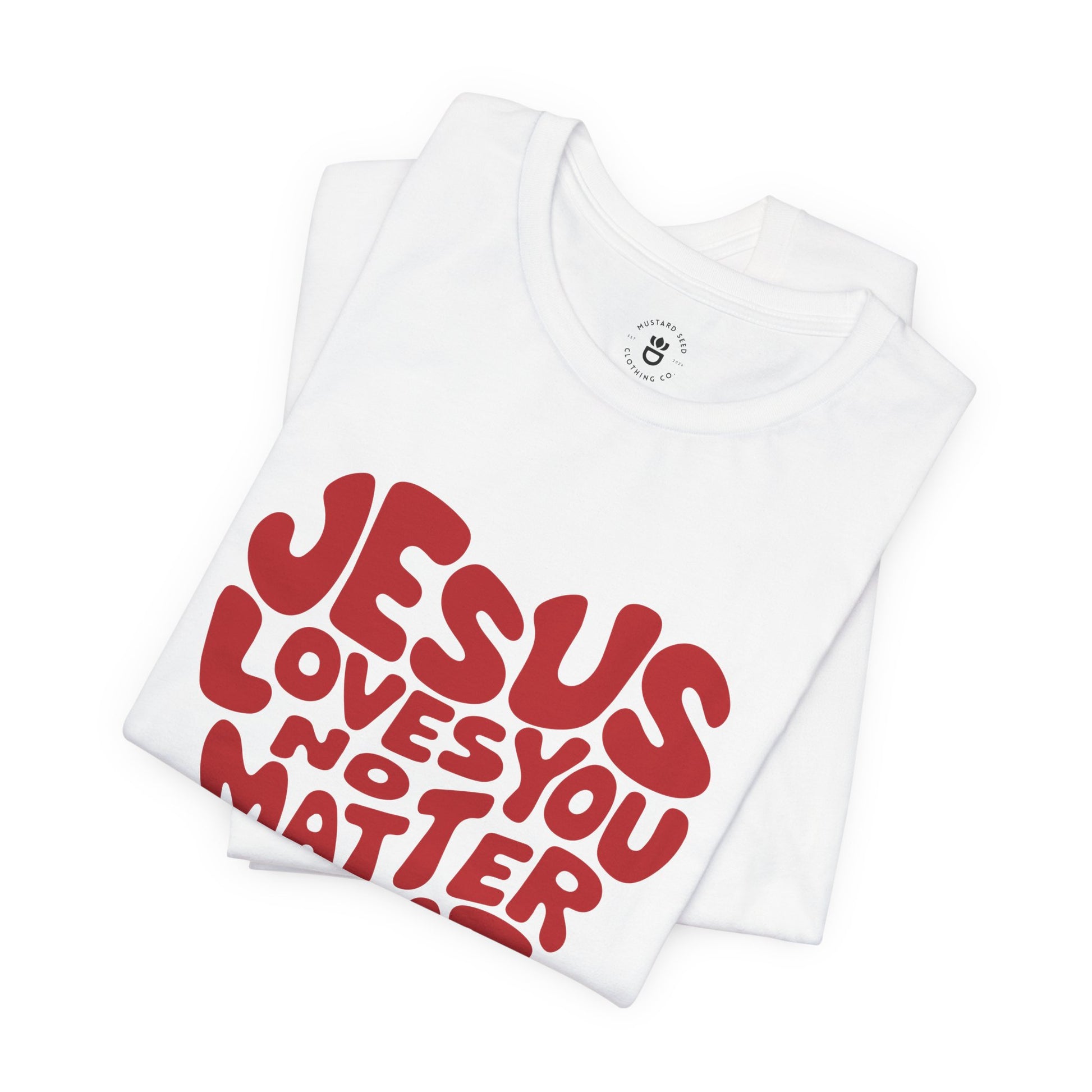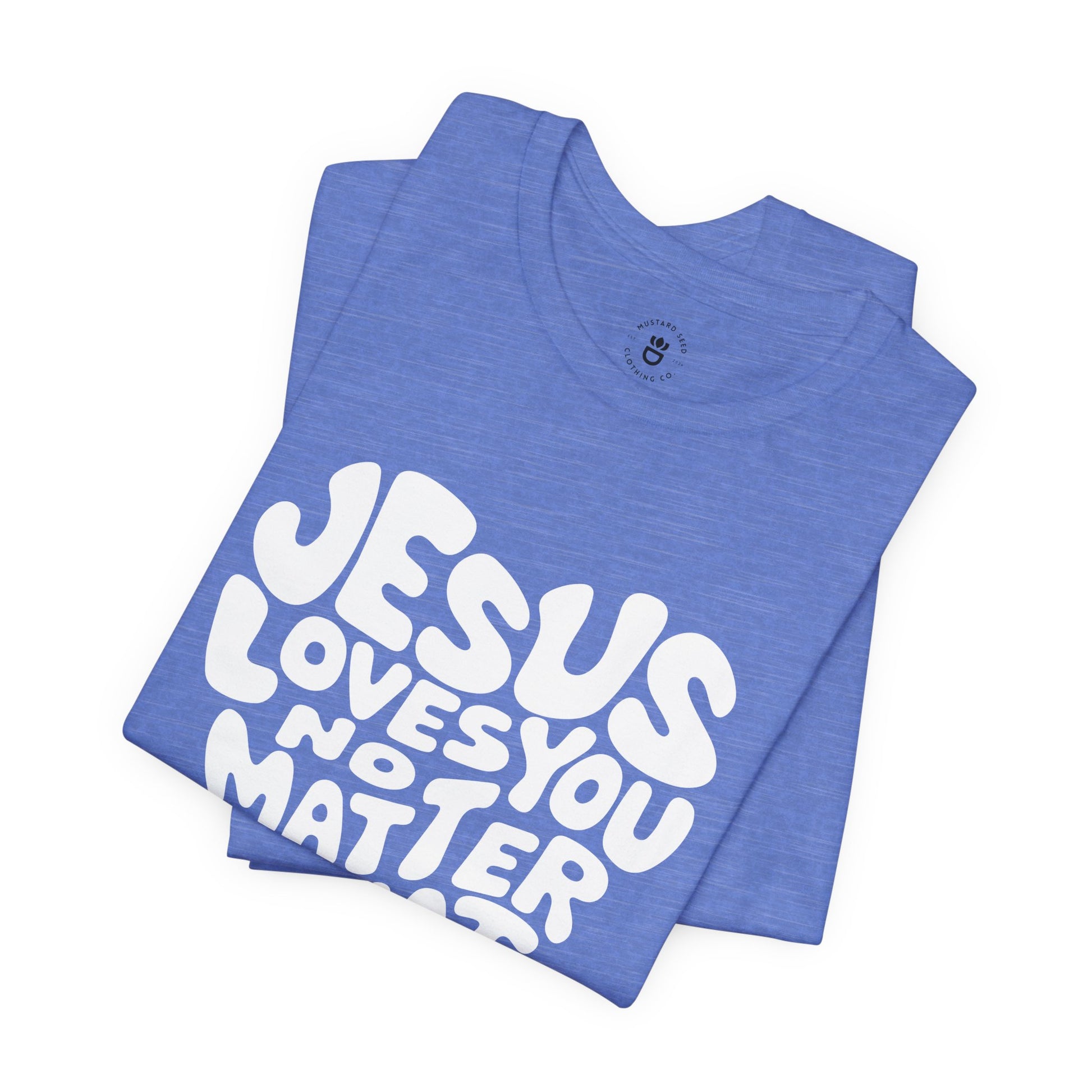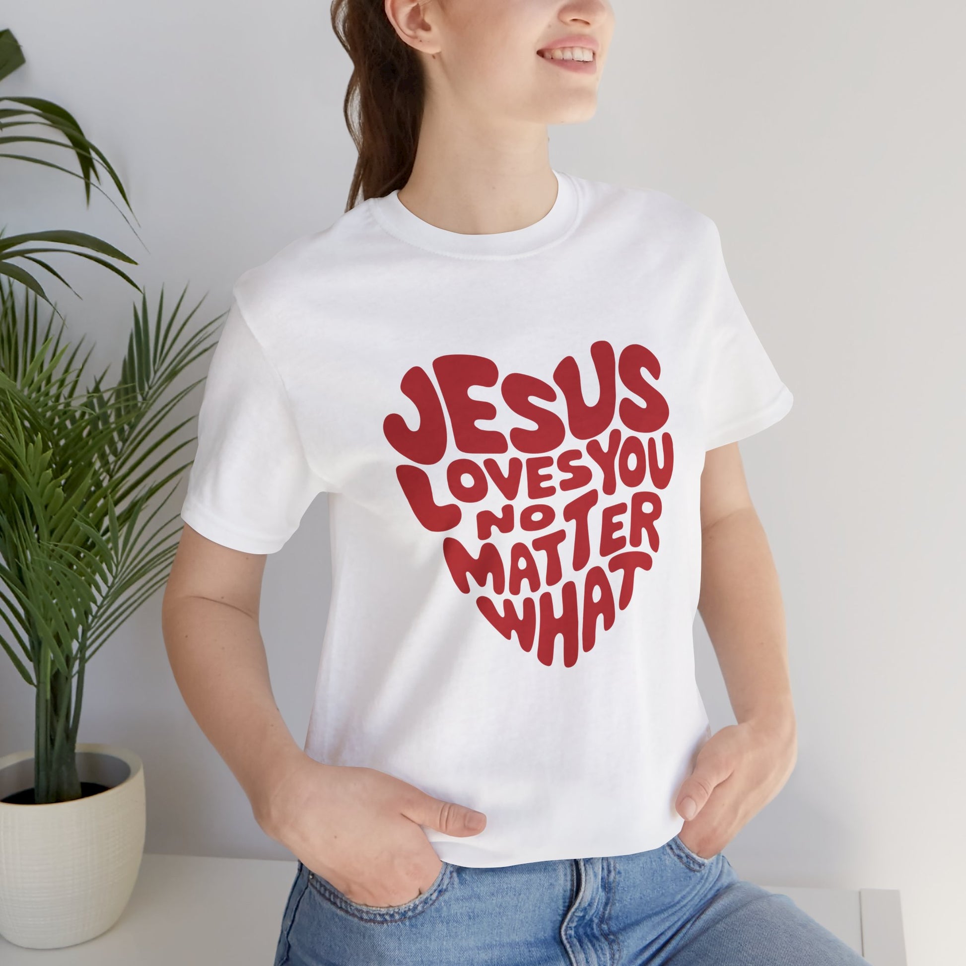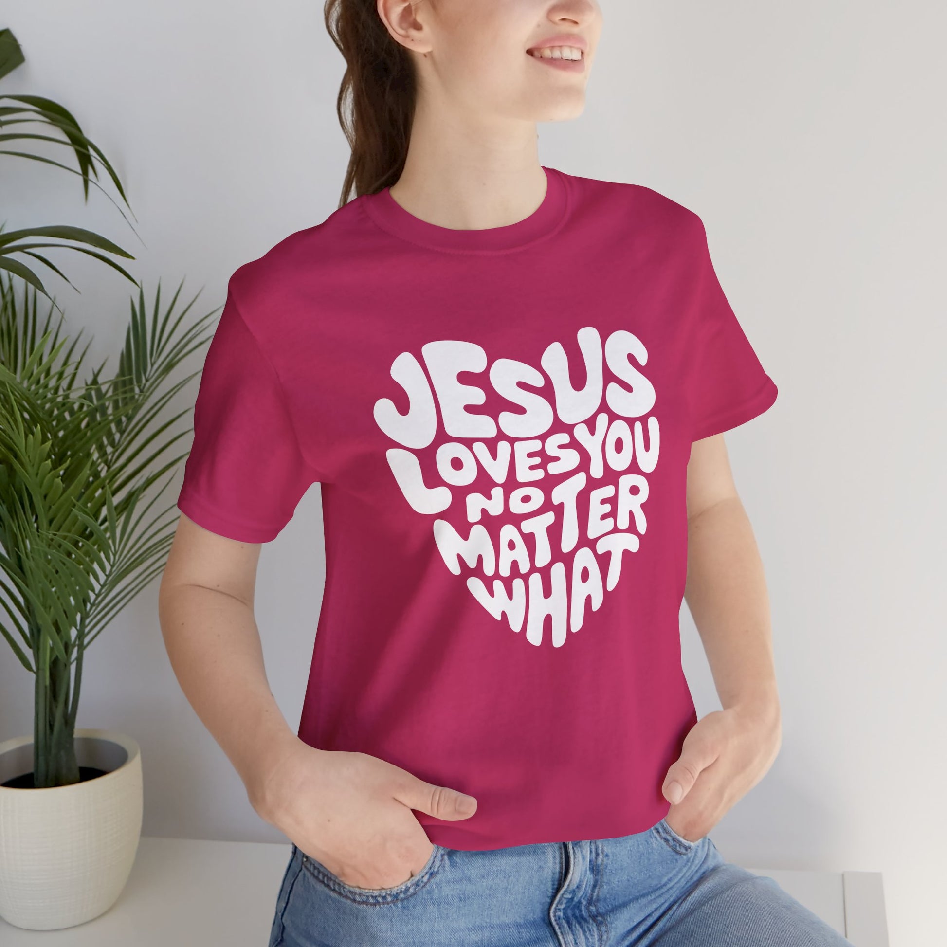 Spread love and positivity with this tee featuring the heartfelt message "Jesus Loves You No Matter What" beautifully crafted in the shape of a heart. Wear it proudly and remind others of the unconditional love of Jesus!