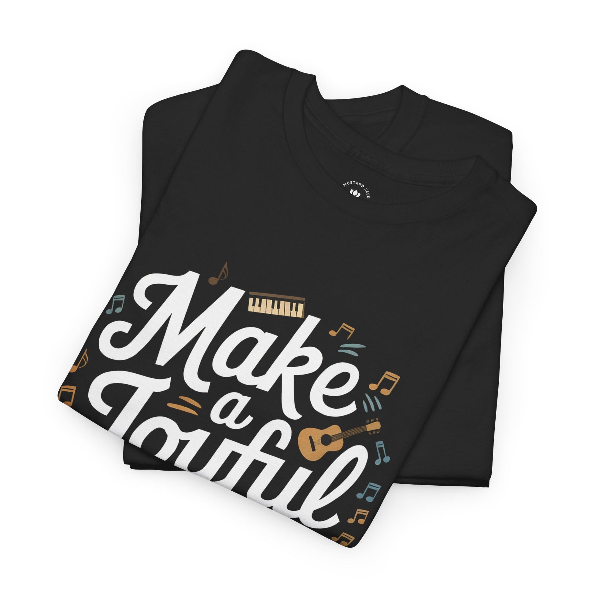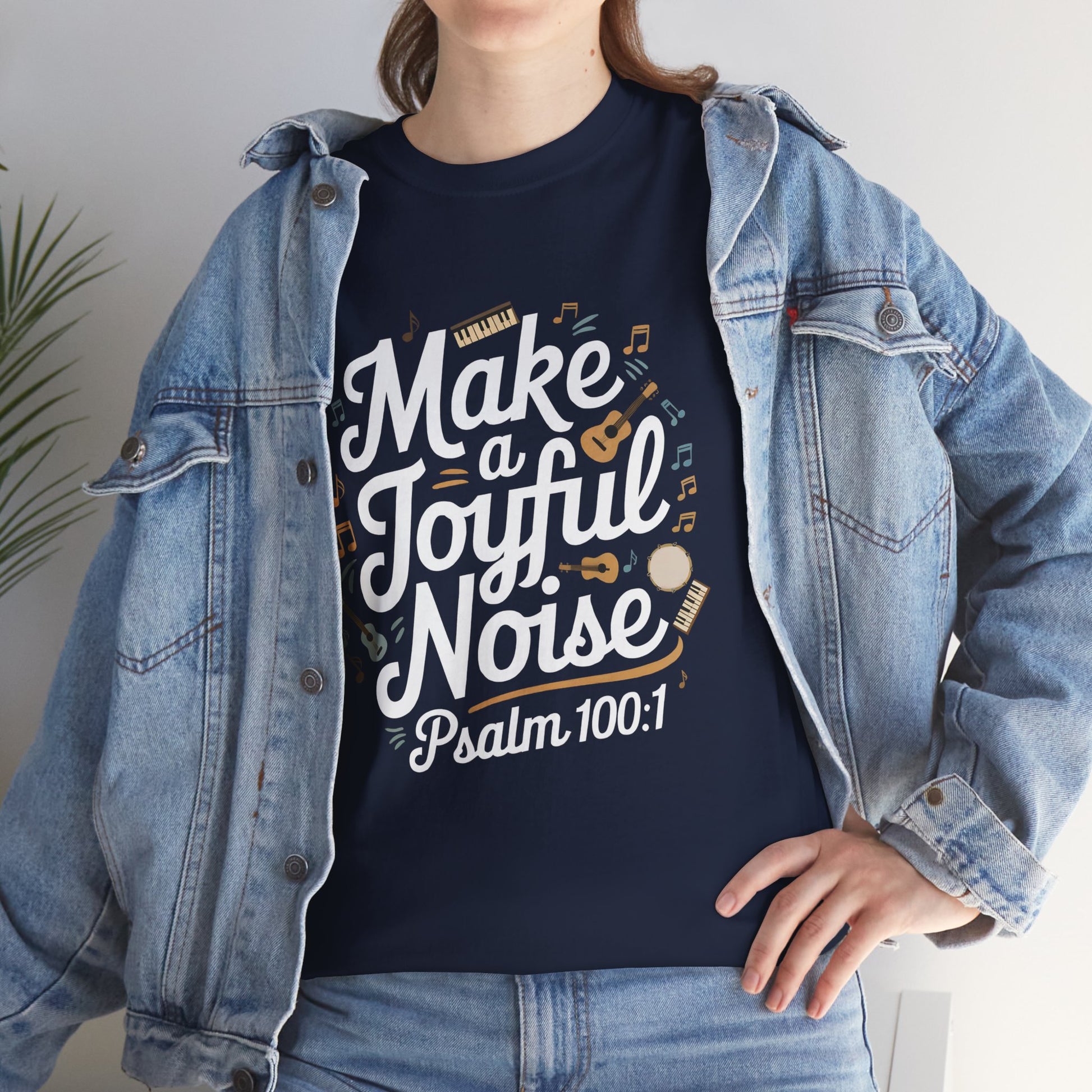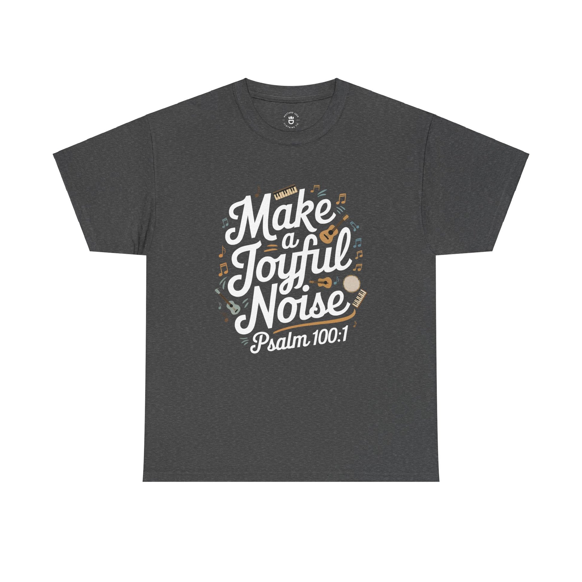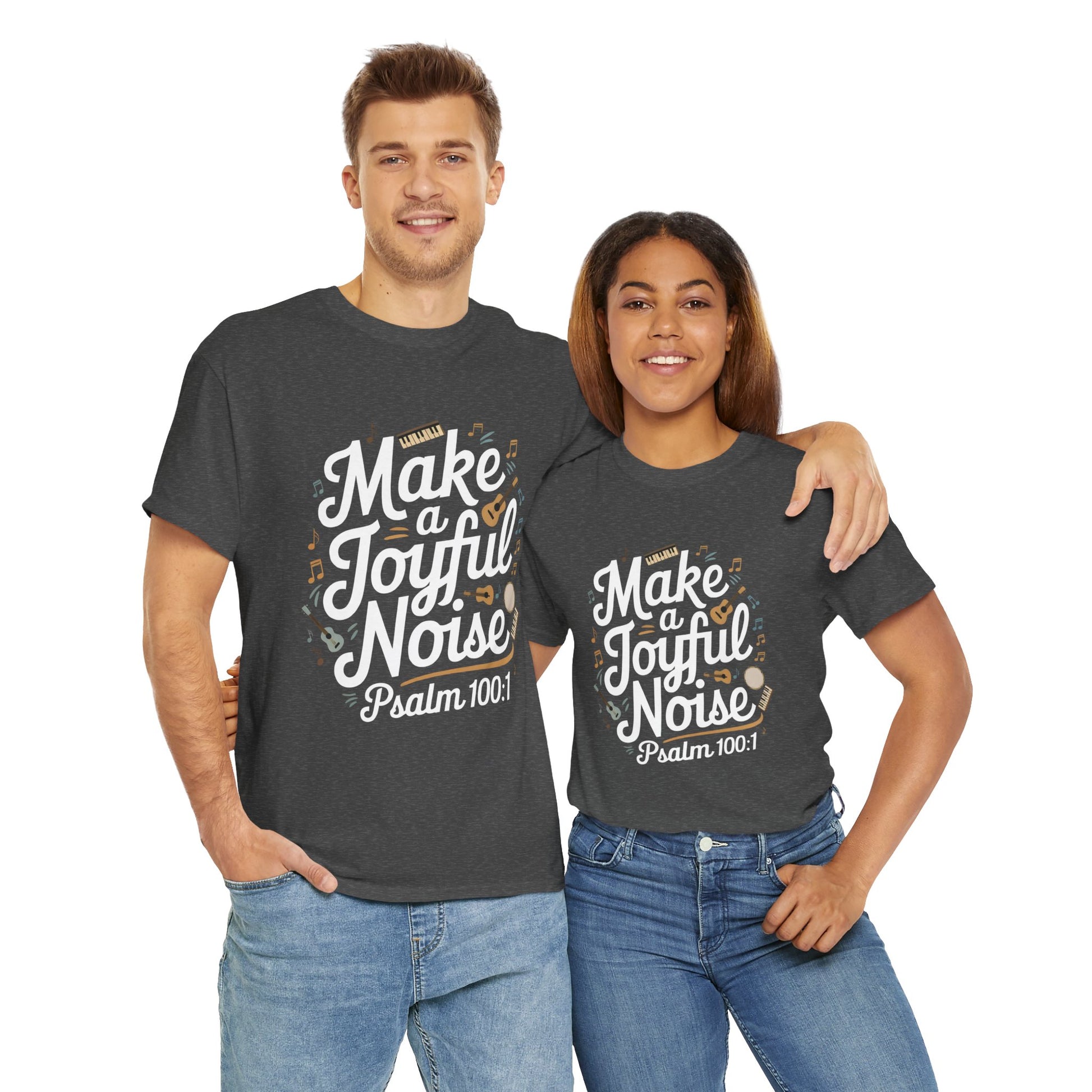 Celebrate faith and music with this 'Joyful Noise' tee, featuring bold script lettering and lively images of instruments and music notes scattered across the design. Perfect for worship leaders, musicians, or anyone who loves to praise through song.