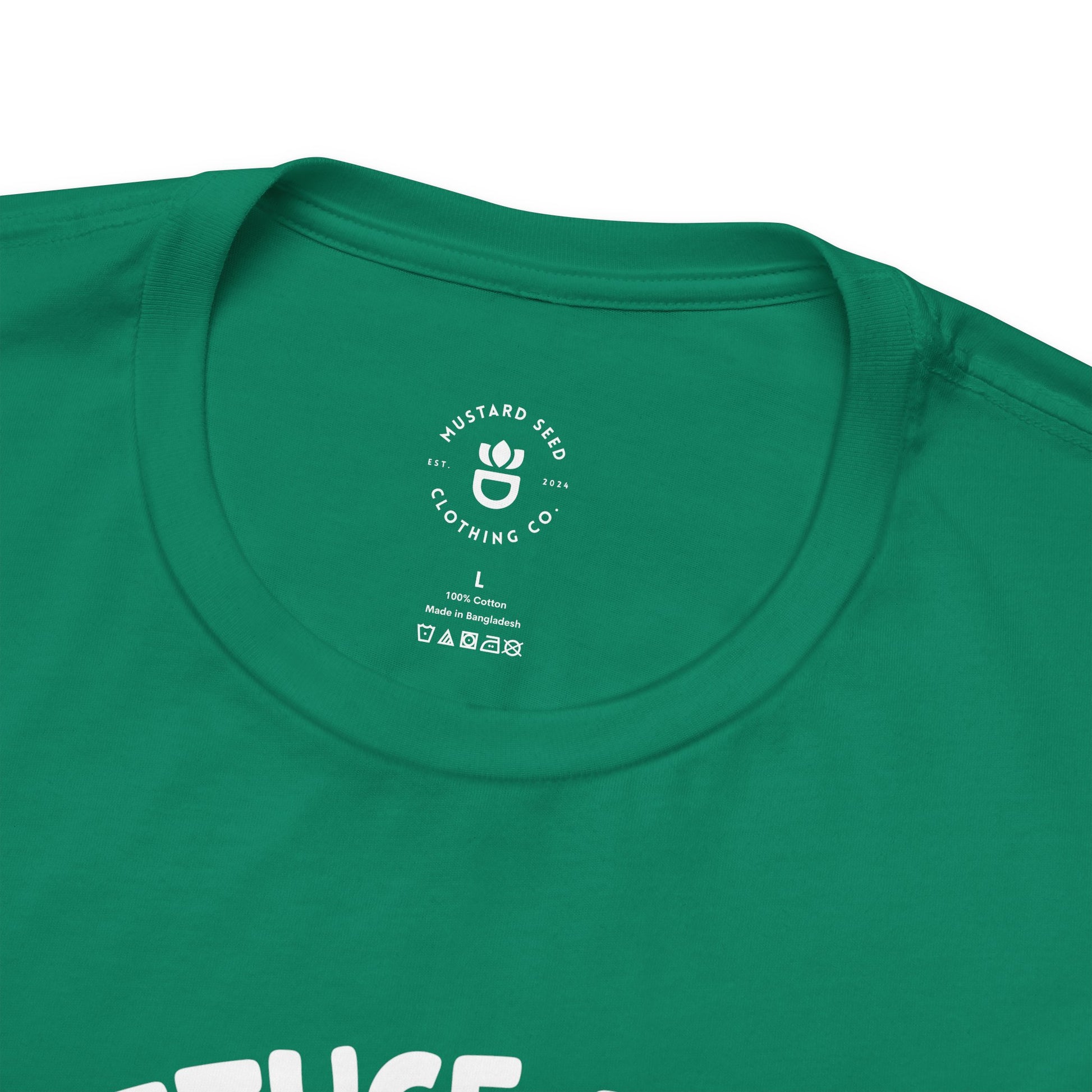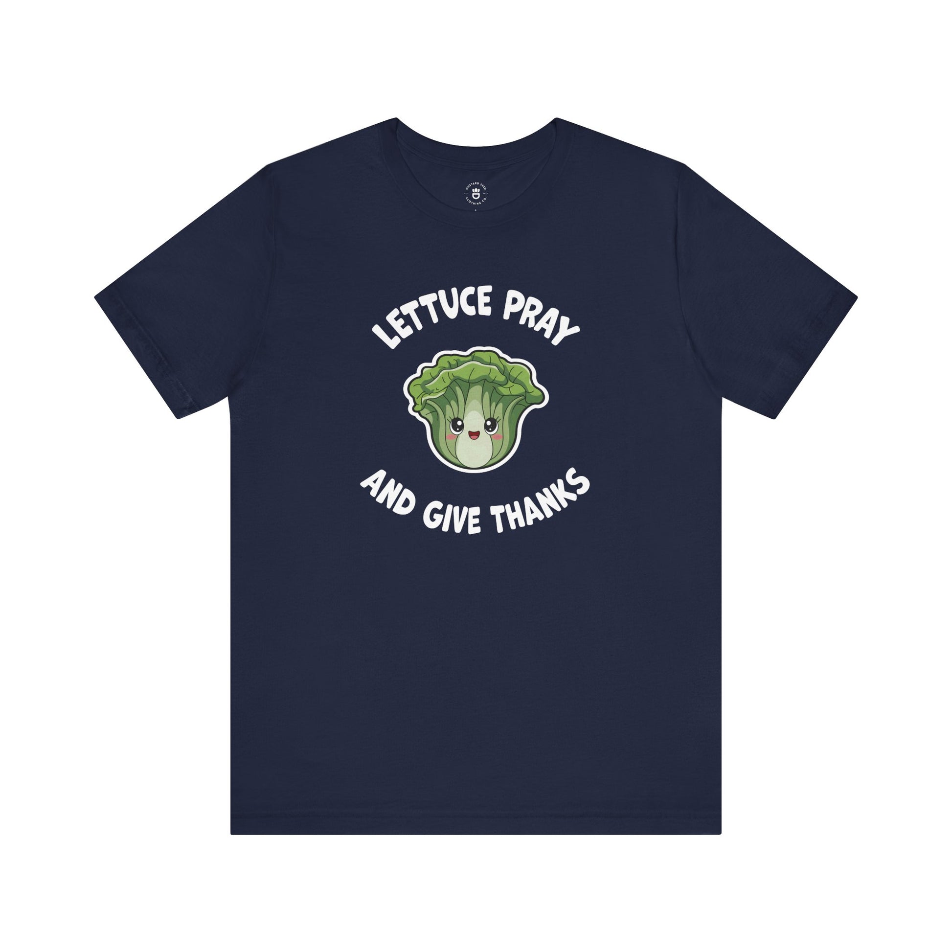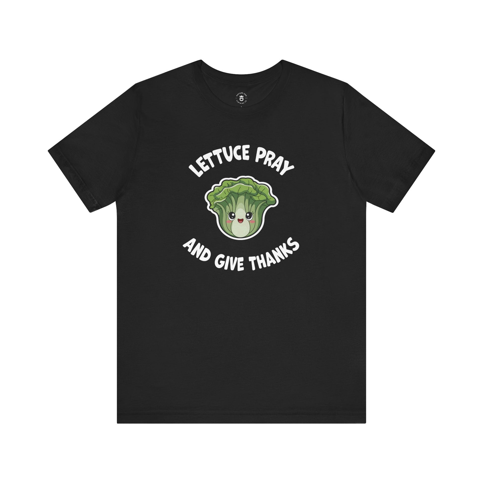 Bring joy to your faith and wardrobe with our ‘Lettuce Pray’ t-shirt! Featuring a cute, smiling cartoon head of lettuce, this shirt is a fun way to remind everyone to pray and be grateful. Perfect for those who love puns, faith, and spreading a little laughter!
