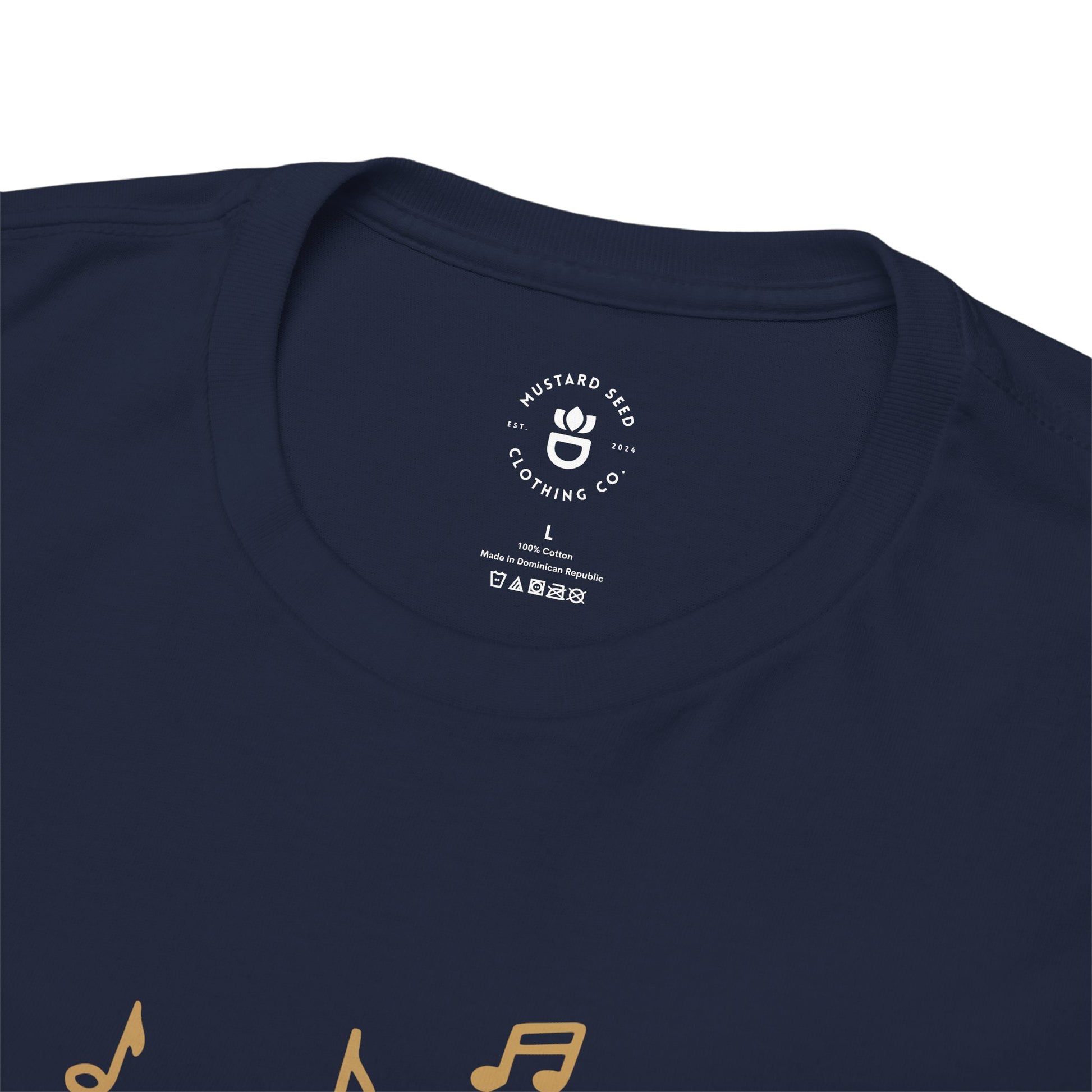 This tee is designed for those who live to praise. Perfect for believers who express their faith through music. This comfortable, high-quality tee features minimalist line art of music notes and a guitar, symbolizing praise through sound. Wear it to share your love of God and music wherever you go!
