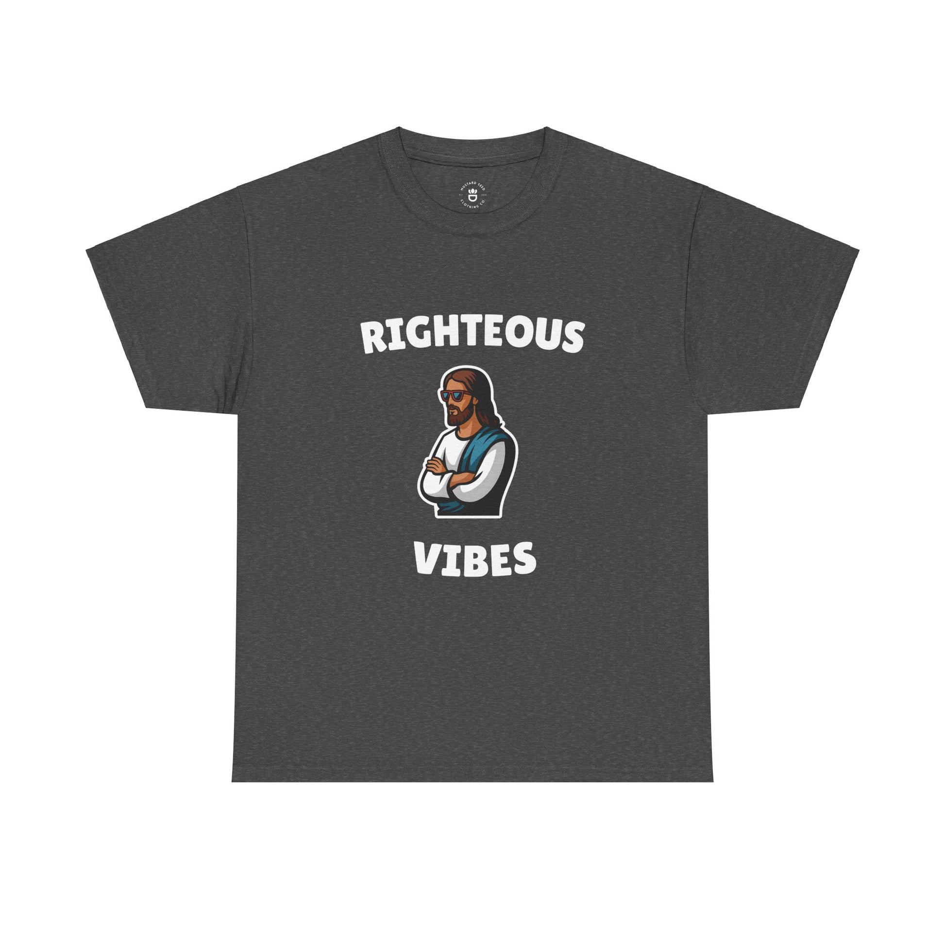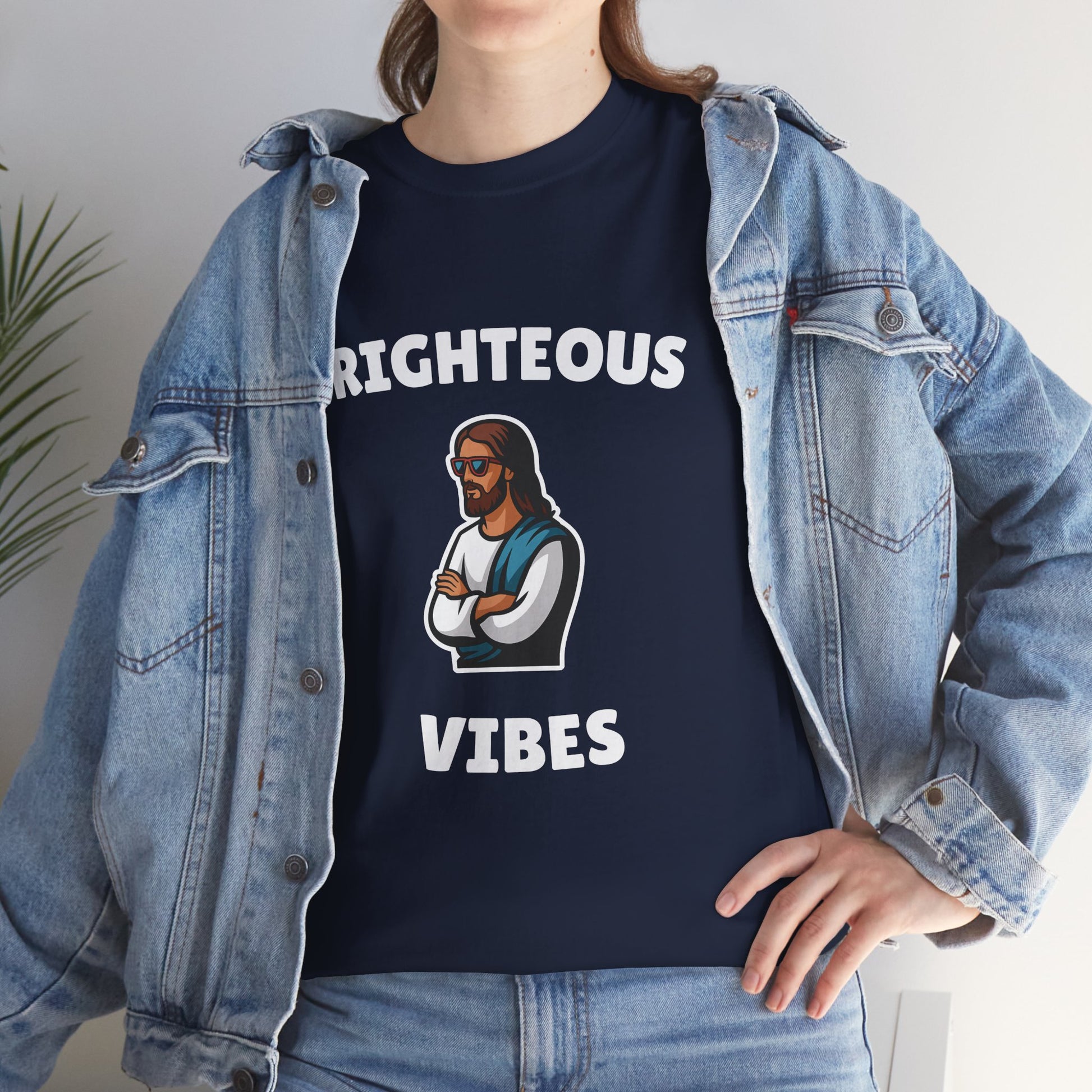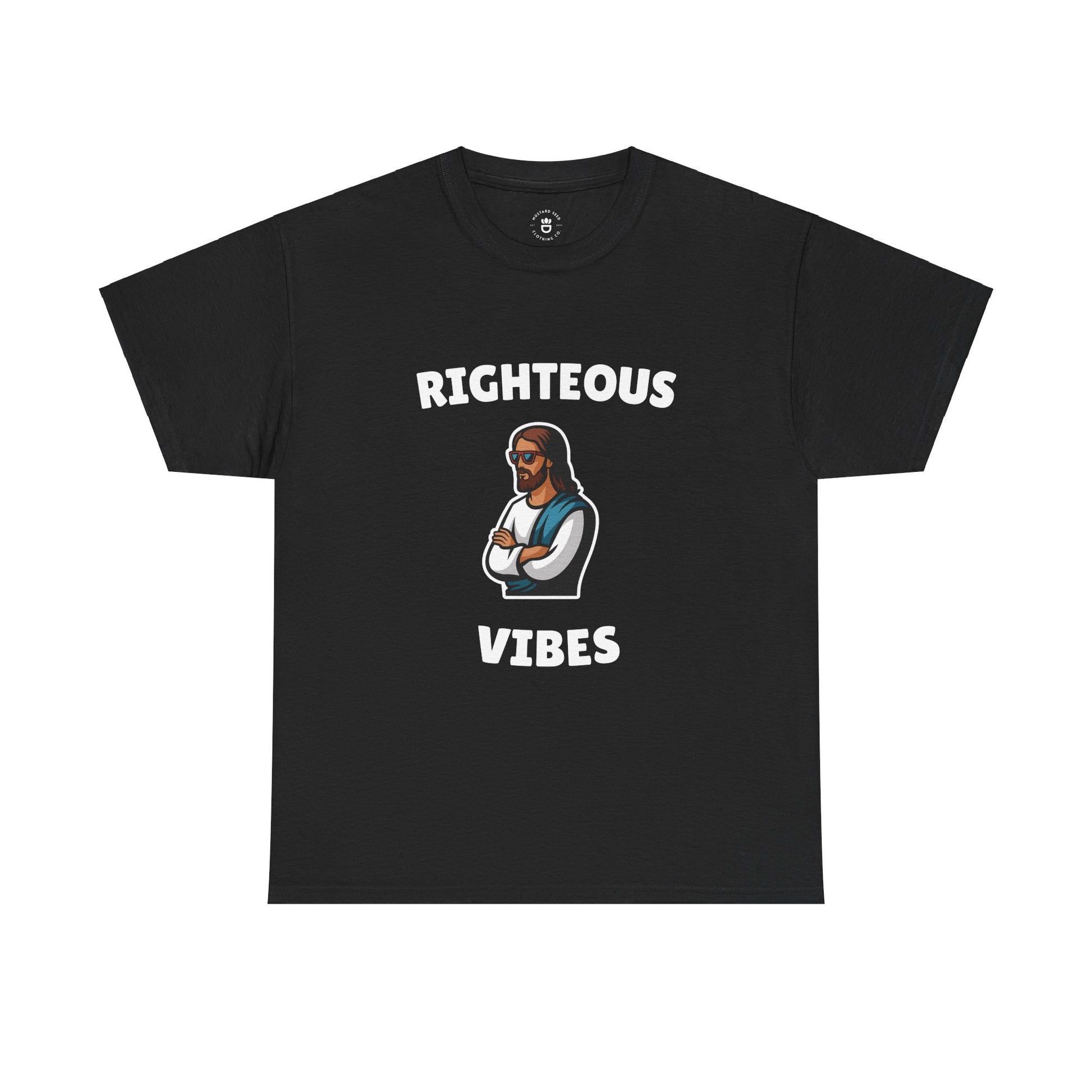 Get ready to spread some smiles with our "Righteous Vibes" tee! This fun and stylish design features a playful image of Jesus, arms crossed and rocking a cool pair of sunglasses, perfectly capturing the essence of divine chill. Wear it as a lighthearted reminder to keep your spirits high and your vibes righteous!