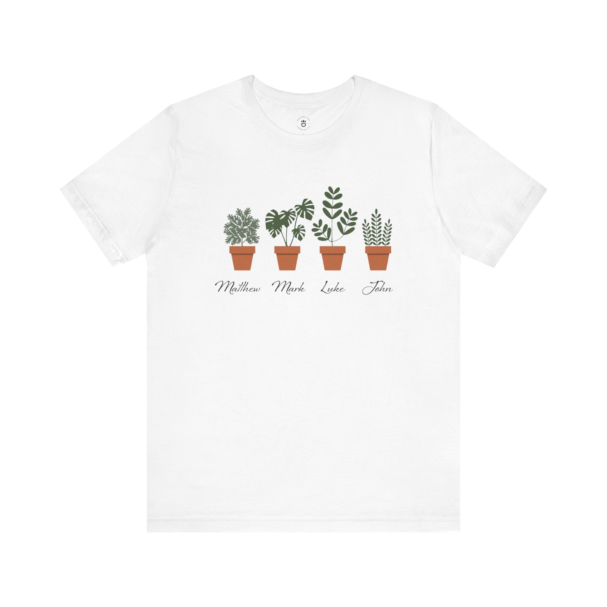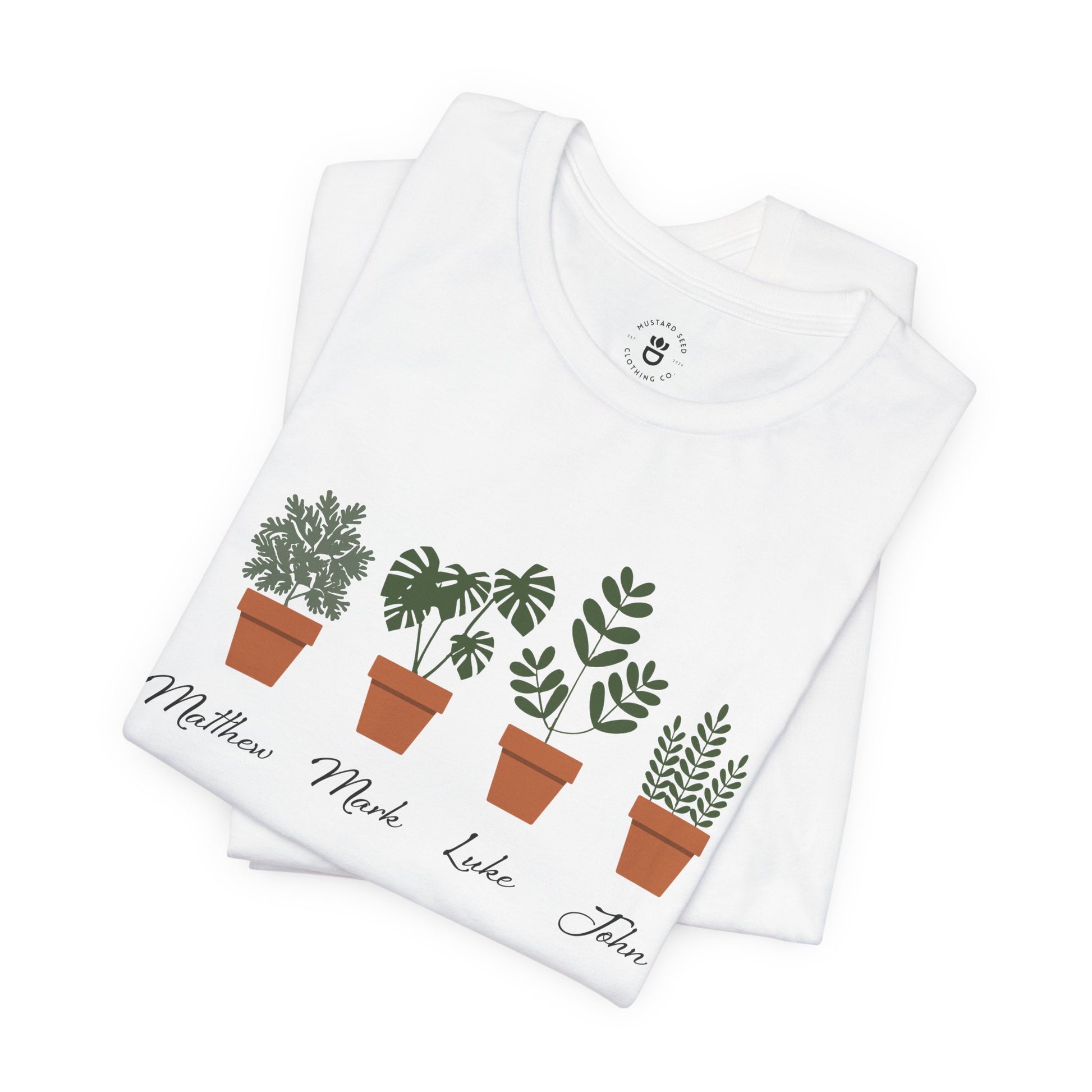 Celebrate your faith with this T-shirt featuring four potted plants, each elegantly labeled with the names of the four Gospels—Matthew, Mark, Luke, and John—in flowing script typography. The unique design serves as a reminder of the growth and nourishment found in the Word. Wear it proudly as a reflection of your faith and love for nature!
