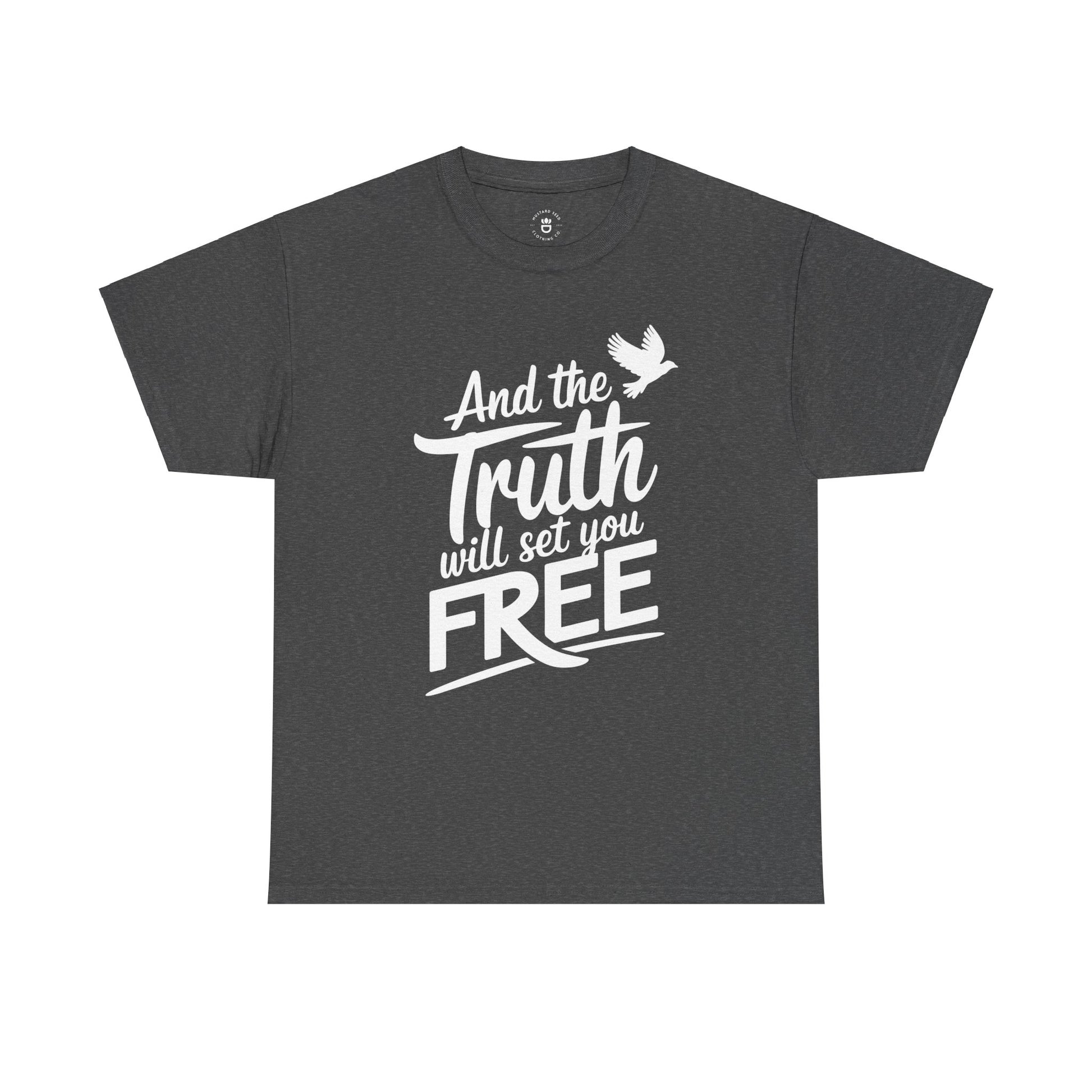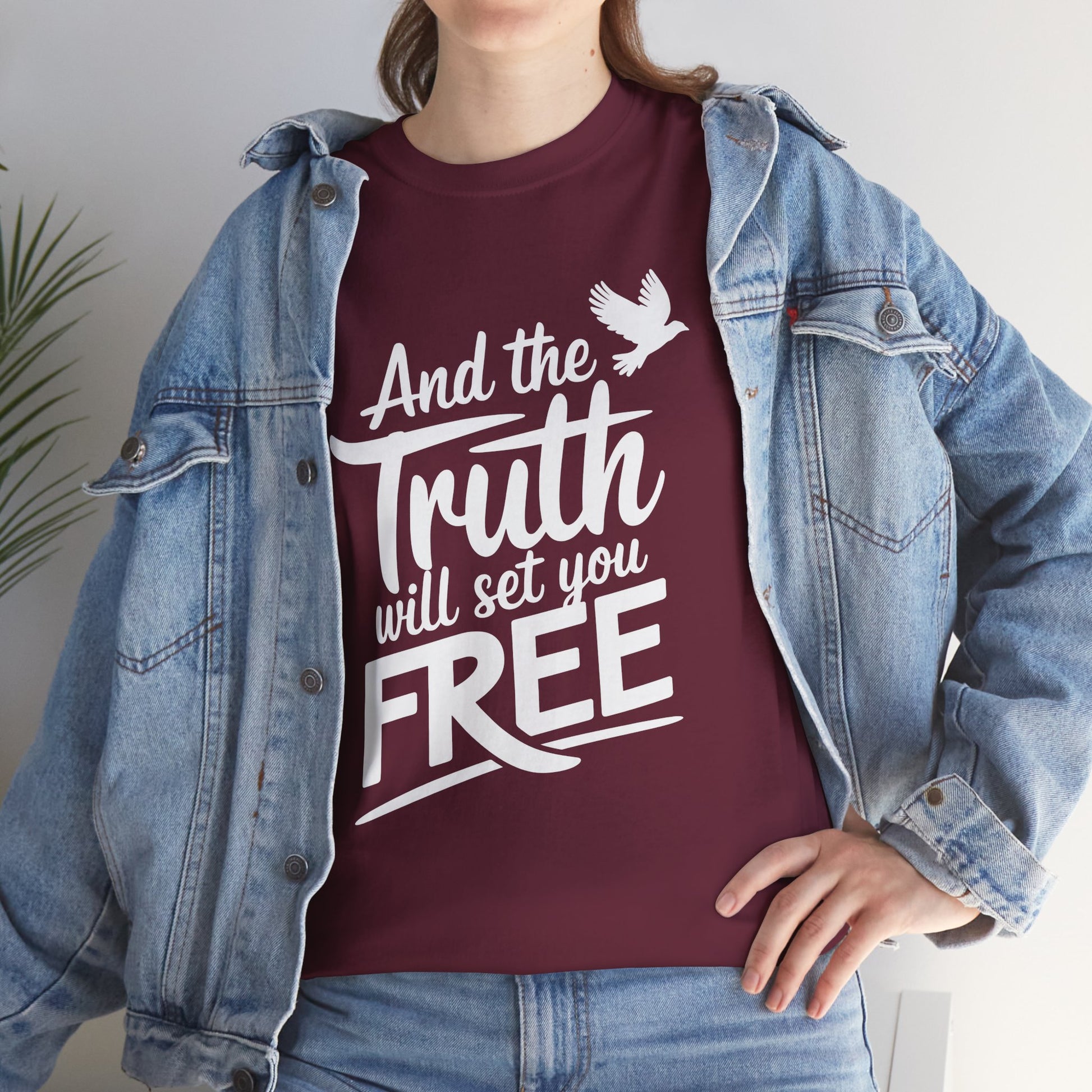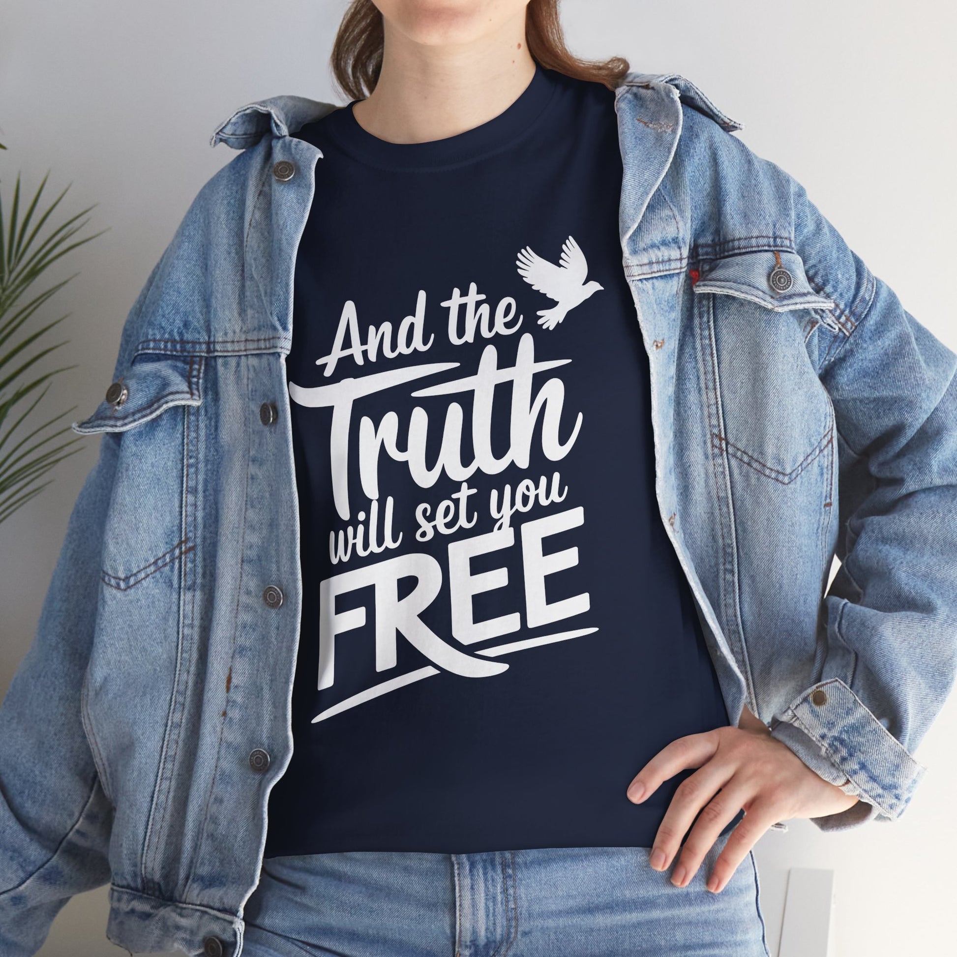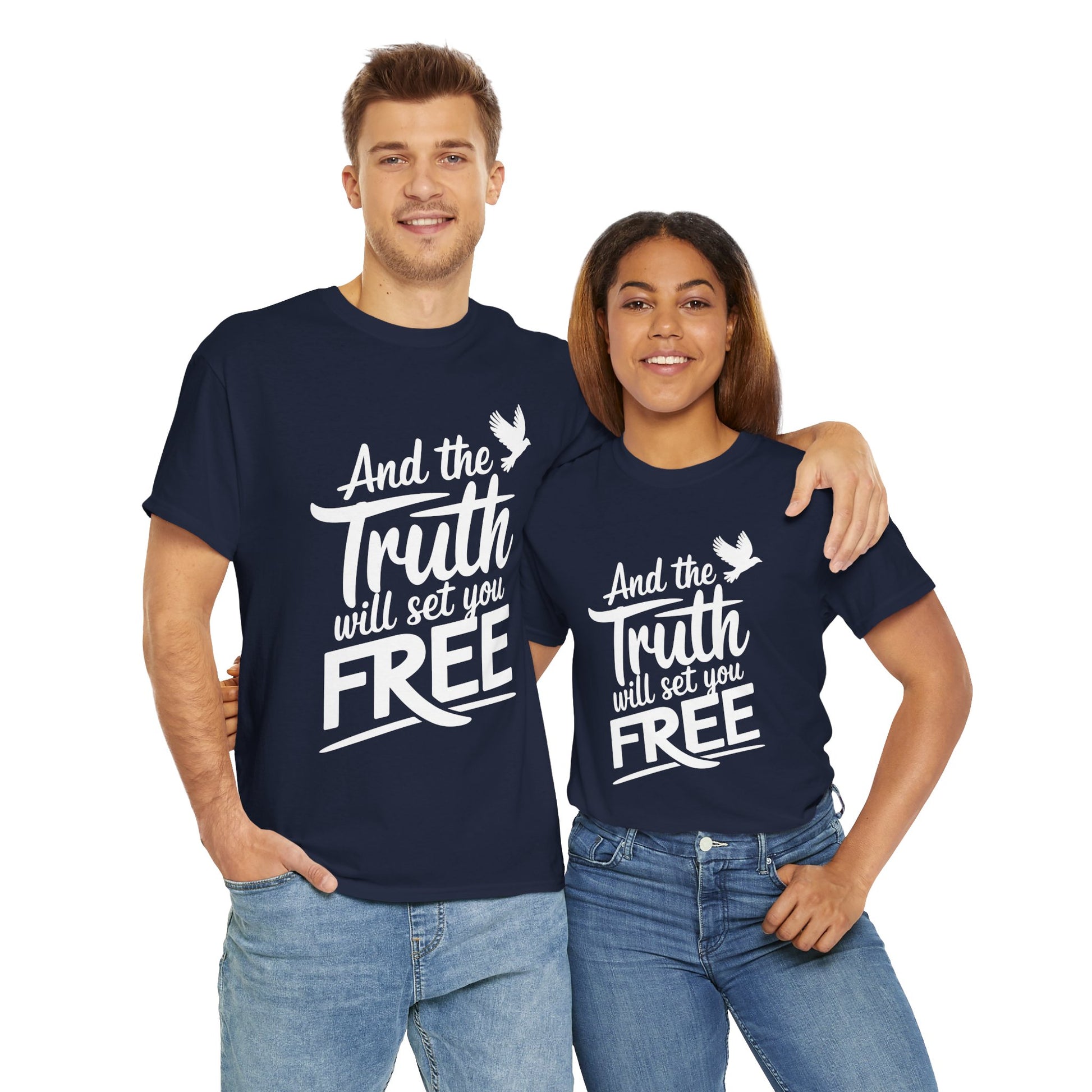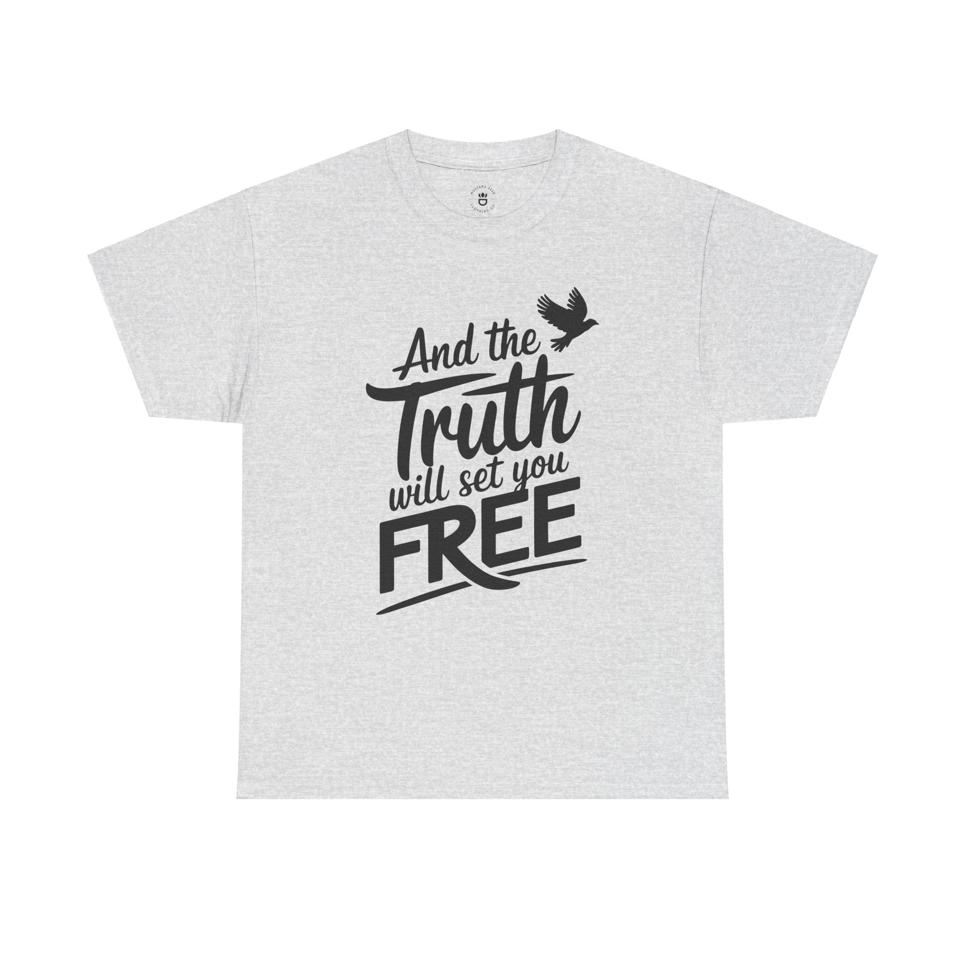 This t-shirt proclaims a timeless promise: "And the truth will set you free." Featuring a graceful silhouette of a bird in flight, the design captures the essence of freedom and faith. This tee is perfect for sharing the message of hope and liberation found in the truth of God’s words.
