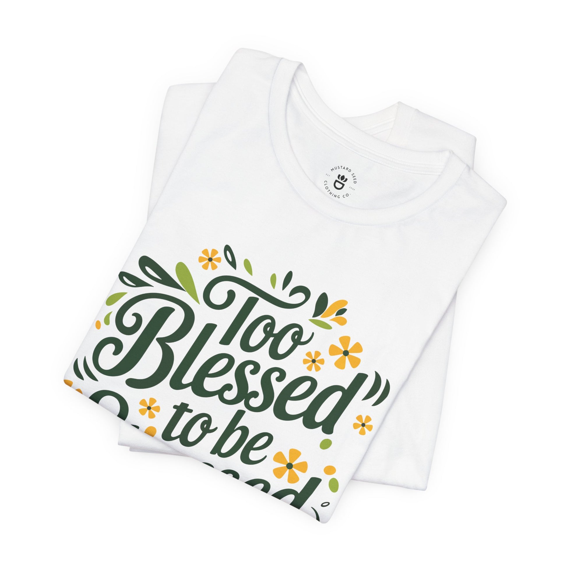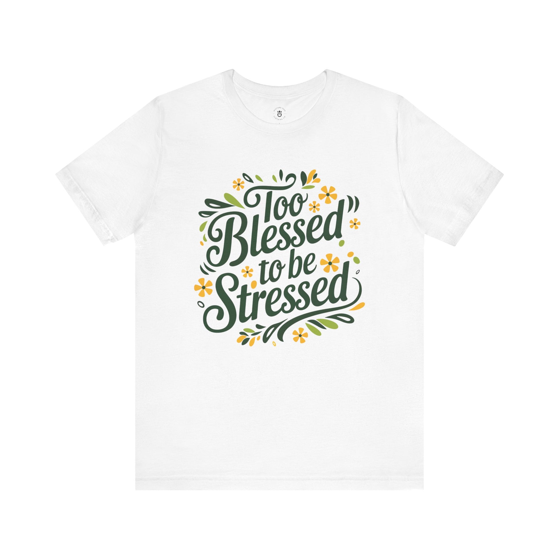 This tee radiates positivity with its heartfelt message, "Too Blessed to Be Stressed." Adorned with delicate green and yellow floral imagery, it brings a fresh, uplifting look to any casual outfit. Let this shirt be a reminder to embrace joy and grace, even on the busiest days.